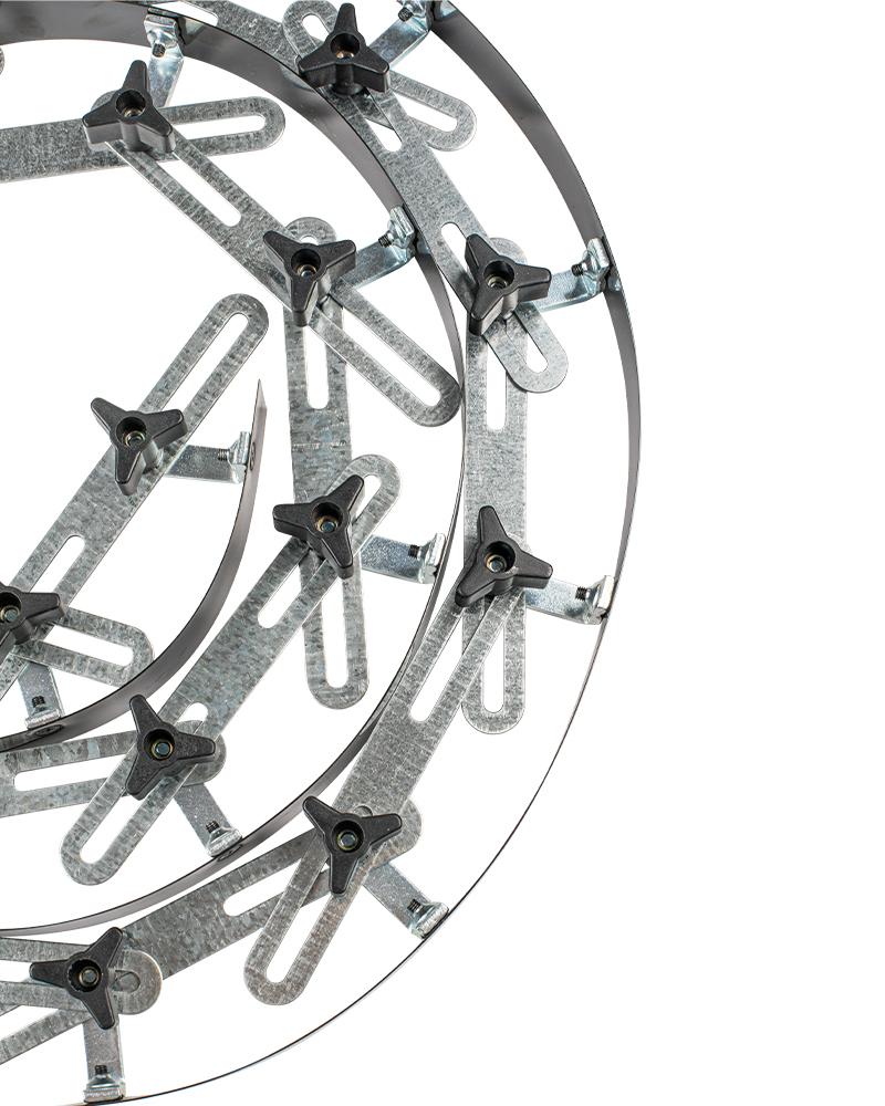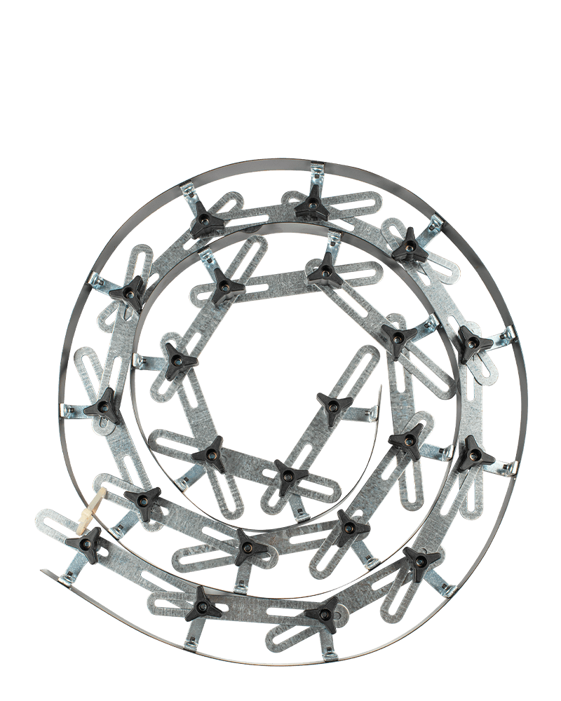 Полностью регулируемая гибкая металлическая кривая. Это решение для копирования, переноса или размещения больших сложных кривых. Лекало представляет собой полосу из пружинной стали шириной 32 мм с серией соединительных пластин и фиксирующих ручек на задней поверхности. Каждый сегмент может быть отрегулирован и заблокирован независимо друг от друга. Ослабление ручек позволяет согнуть полоску в нужное положение, затягивание ручек фиксирует изгиб. Перестраивается под любую криволинейную фигуру.