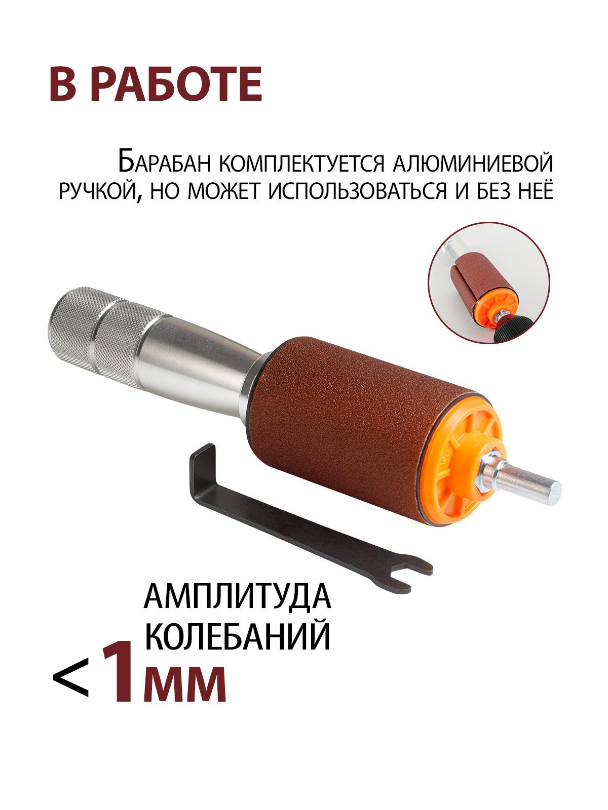 Барабан комплектуется алюминиевой ручкой, но может использоваться и без нее. Идеально подходит для ручной шлифовки криволинейных и других поверхностей. Используется с аккумуляторной дрелью или шуруповертом и его можно брать куда угодно.
