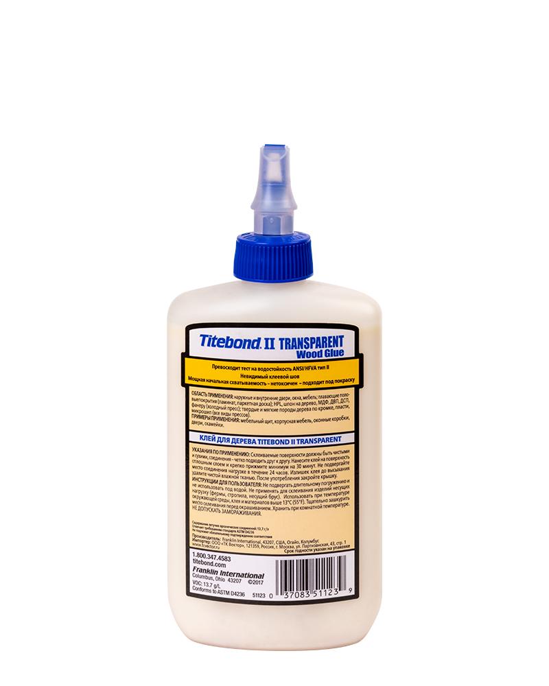 ОГРАНИЧЕНИЯ: Titebond II Transparent Wood Glue не предназначен для длительного погружения в воду или для использования ниже ватерлинии. Не предназначен для использования в несущих конструкциях. Не используйте при температуре клея или склеиваемых материалов ниже 10°C . Из-за низкого pH продукт может вызывать коррозию на металлических поверхностях, протестируйте продукт перед использованием. Замораживание не повлияет на функциональность продукта, но может привести к его загустению. Перемешивание должно вернуть продукту первоначальную форму. Из-за различий в поверхности обрабатываемых пиломатериалов, рекомендуется провести проверку на адгезию. Для достижения наилучших результатов при склеивании материалов из экзотических или маслянистых пород дерева, таких как Ипе (орех) и тик, пожалуйста, свяжитесь с нашей службой технической поддержки по телефону 8-495-818-65-67. Перед использованием ознакомьтесь с правилами безопасности. БЕРЕЧЬ ОТ ЗАМЕРЗАНИЯ. ХРАНИТЬ В НЕДОСТУПНОМ ДЛЯ ДЕТЕЙ МЕСТЕ.
