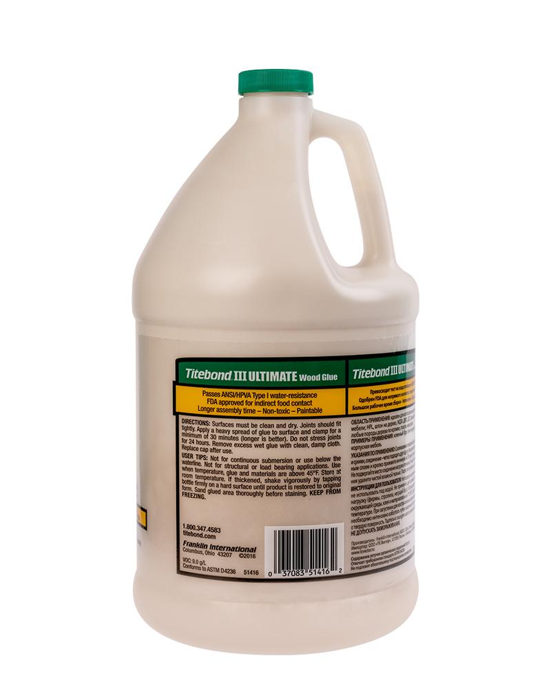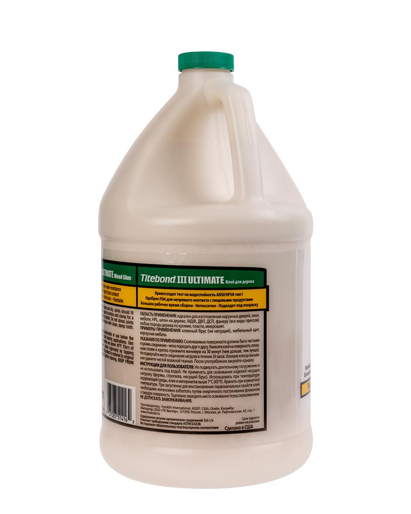 Titebond III Ultimate Wood Glue – это первый из когда-либо предлагавшихся однокомпонентных водостойких клеев для дерева, который доказал свою максимальную водостойкость. Формула соответствует требованиям ANSI/HPVA Type I (D3+) и обеспечивает превосходную прочность склеивания, более длительное время открытой сборки и более низкую температуру нанесения. Titebond III нетоксичен, не содержит растворителей и очищается водой до высыхания – безопаснее в использовании, чем традиционные водостойкие клеи для дерева. Он обеспечивает прочную первоначальную адгезию, легко наносится без размягчения и может иметь непрямой контакт с пищевыми продуктами (разделочные доски). Лучший клей для дерева – идеально подходит как для внутренних, так и для наружных работ.