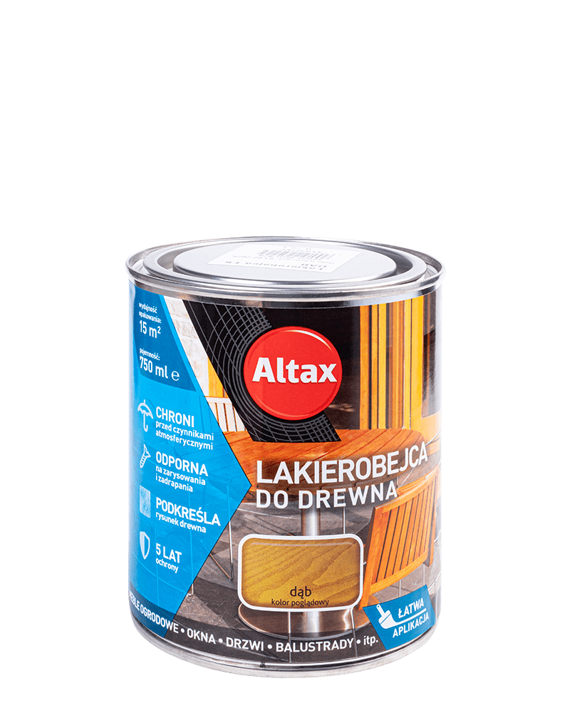 Лак-морилка для наружных работ Altax LAKIEROBEJCA надёжно защитит древесину от атмосферных воздействий и сохранит её цвет на долгие годы. Это придаст атласной отделке изысканный вид и подчеркнёт её уникальный рисунок.