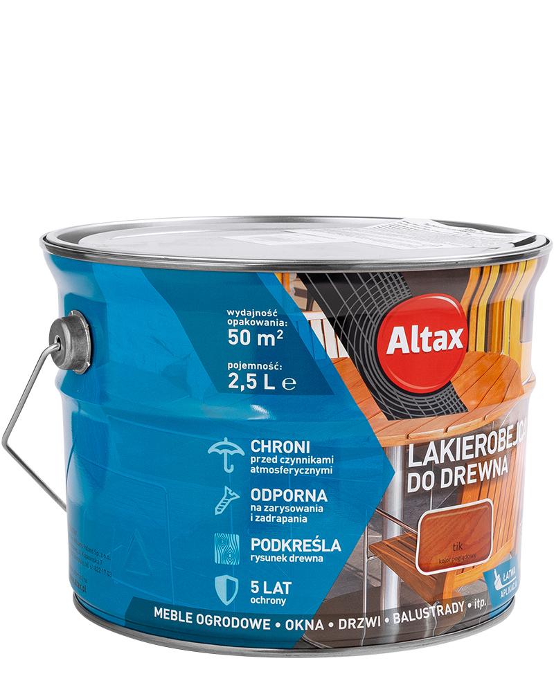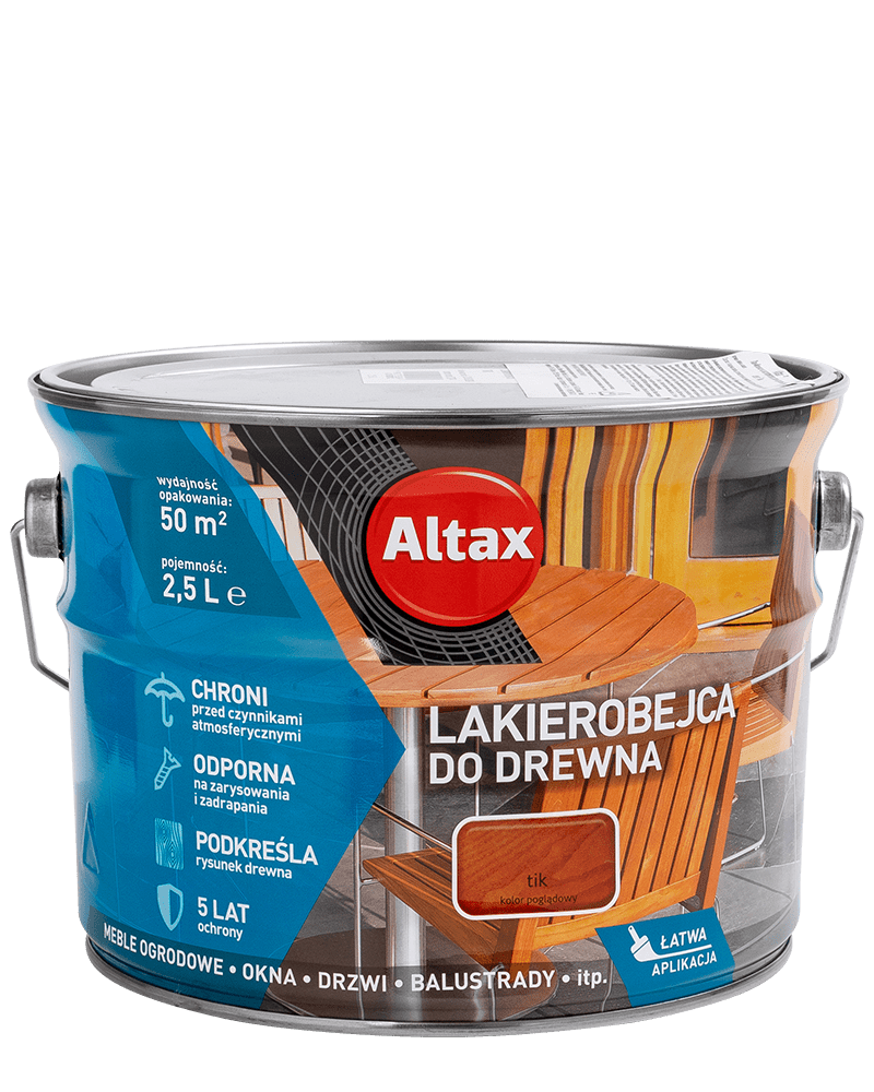 Лак-морилка для наружных работ Altax LAKIEROBEJCA надёжно защитит древесину от атмосферных воздействий и сохранит её цвет на долгие годы. Это придаст атласной отделке изысканный вид и подчеркнёт её уникальный рисунок.