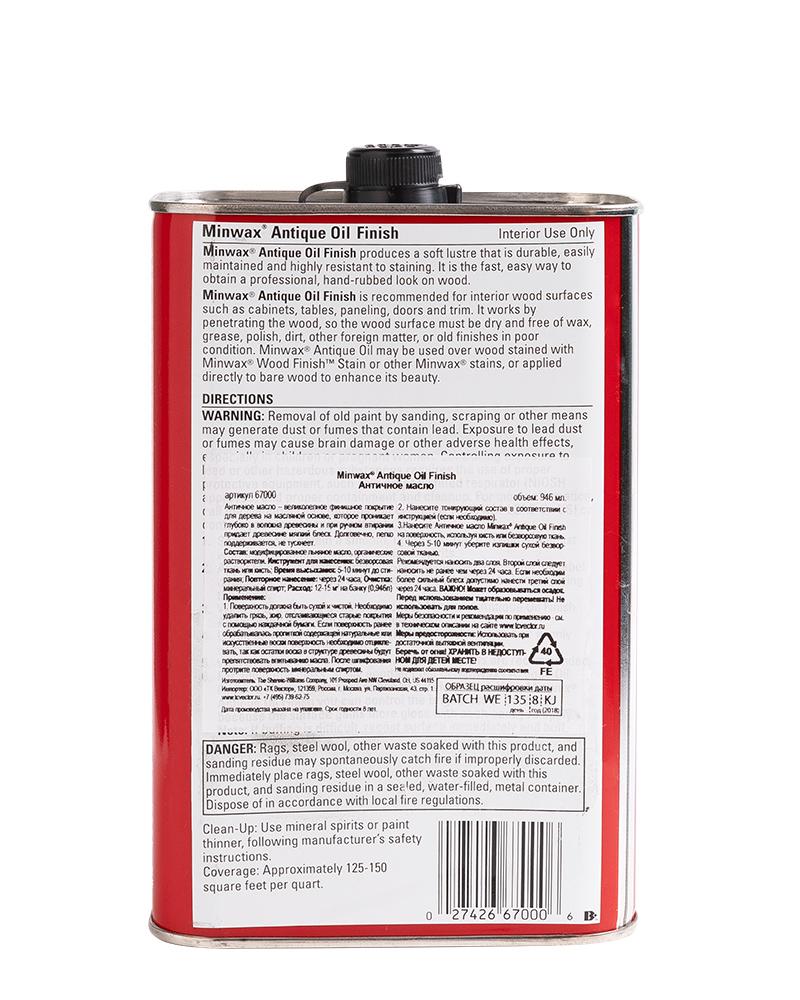 Minwax® Antique Oil Finish можно использовать как для деревянных изделий с финишным покрытием, так и для чистой древесины. Рекомендуется для деревянных поверхностей внутри помещений, таких как шкафы, столы, панели, двери и отделка. Идеально для антикварной мебели. Не использовать для полов.