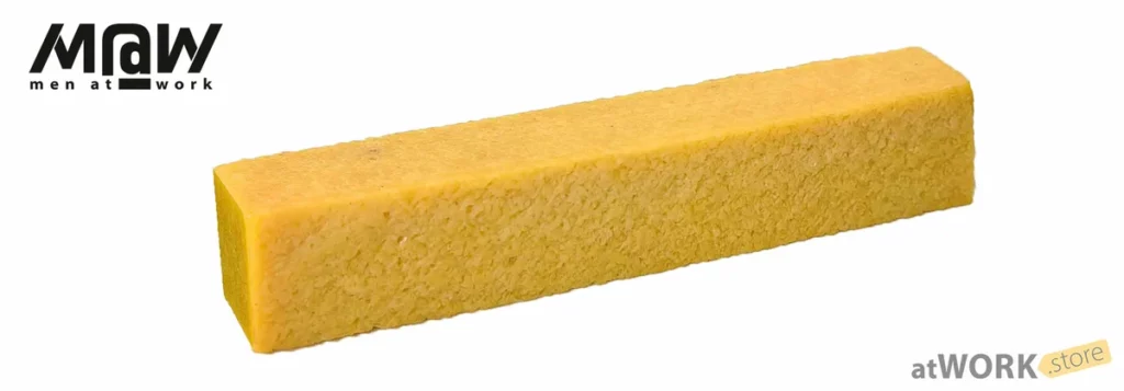 Блок – очиститель абразивной ленты, ТМ Men at Work. Выполнен из упругого вязкого полимера и имеет форму бруска с размерами 38 х 38 х 215 мм. Используется для очистки наждачной бумаги, шлифовальных лент, дисков и кругов, и другого абразивного материала, загрязненного отходами шлифовки. Увеличивает срок службы лент и дисков от 2 до 4 раз. Подходит для электроточил, шлифовальных машин, гриндеров, а также для различных адаптеров для ручного шлифования.