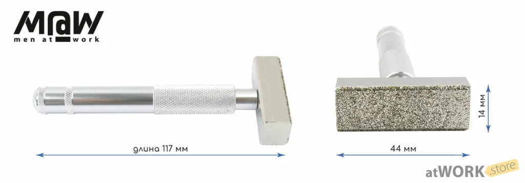 Правило алмазное с зерном 120, для выравнивания шлифовальных кругов, TM MEN AT WORK. Применяется, в основном, для очищения и чистовой доводке/правке жестких абразивных кругов. Это алмазное правило (ударение на букву «и»). Состоит из мощной головка размером 14 х 44 мм с алмазным покрытием и ручки с накаткой для надежного захвата. Общая длина инструмента 117 мм.
