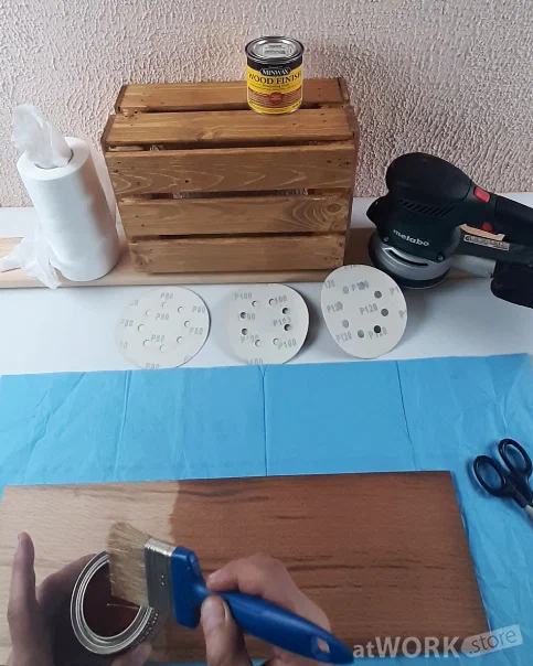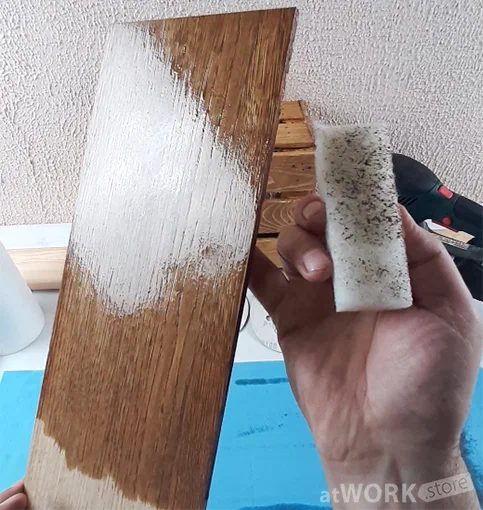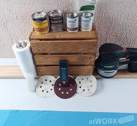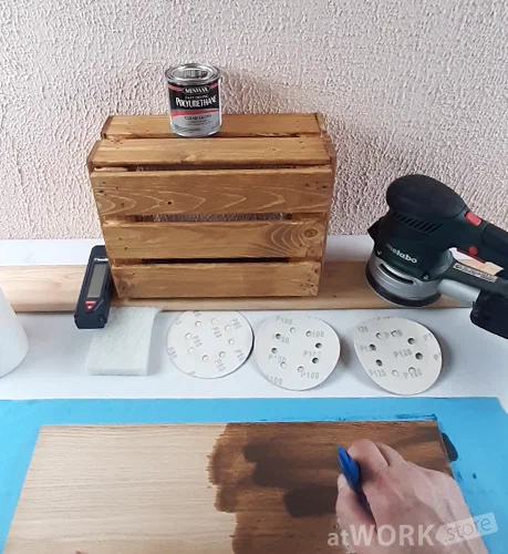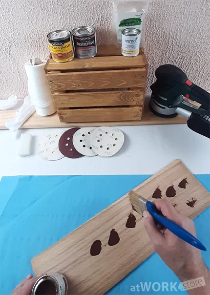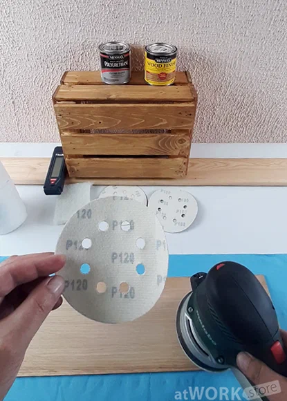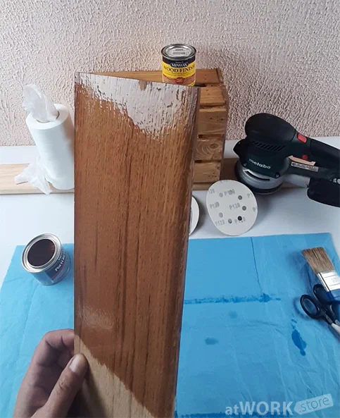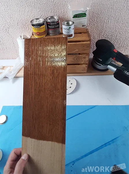 - Далее обязательный этап шлифования. Используем орбитальную шлифовальную машинку и диски на липучке с зерном от 60 до 220 , а также листовые абразивы разной зернистости и деревянный брусок. Шлифованием мы убираем неровности и царапины от режущего инструмента, убираем остаточный ворс и открываем поры. Морилка OSMO требует более тщательного шлифования из-за большой вязкости, причем рекомендуется начинать с зерна 60 и доходить до 120 (полы) и до 220 (мебель) в последовательности 60-80-100-120-(180-220 – для мебели). Для морилки MINWAX требуется только добиться гладкости и отсутствия ворса (для пола мах. 120 зерно и для мебели 220 и выше). Проверка на ворс такая: проводим тонкой безворсовой тканью по отшлифованной поверхности, если цепляется , значит ворс остался и надо продолжить шлифование. Новые шлиф. круги сначала обкатать на ненужной деревяшке для выравнивания абразивных зерен. После каждого шлифования аккуратно очищаем поверхность чистой тканью (или пылесосом).