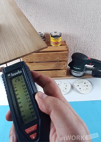 - Использовать необходимо только сухую древесины (для интерьера оптимальное влагосодержание древесины около 8%-10% ). Влажная древесина создаст трудности с удалением ворса, с проникновением морилки и проблемы с усыханием в условиях интерьера. С помощью игольчатого измерителя определяем влагосодержание древесины, влажную древесину необходимо подсушить перед использованием.